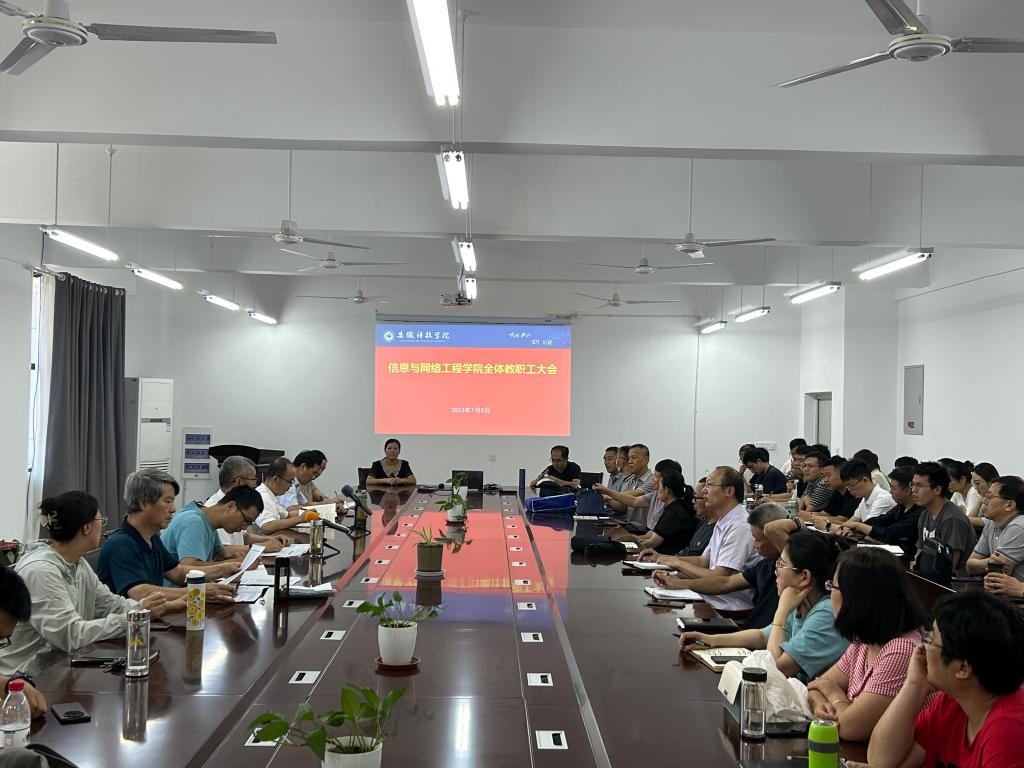 7月5日下午,信息与网络工程学院在尚行楼B418会议室召开教职工大会部署期末和暑期重点工作,学院党政领导及全体教职工参加会议,会议由学院党委书记王振其主持。
