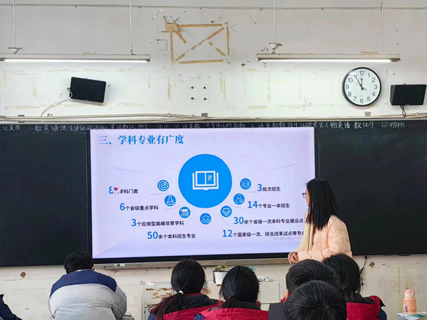 1月18日,邢雨洁带领团队一起回到母校涡阳县第一中学,借助PPT宣讲和互动交流等多种方式,向高中师生全方位介绍了bat365在线平台官方网站的办学实力、校园环境、文化活动、优秀校友、发展成果等,传播安科声音,展现安科学子风采,扩大安科社会影响力,鼓励广大优秀学子报考安科。